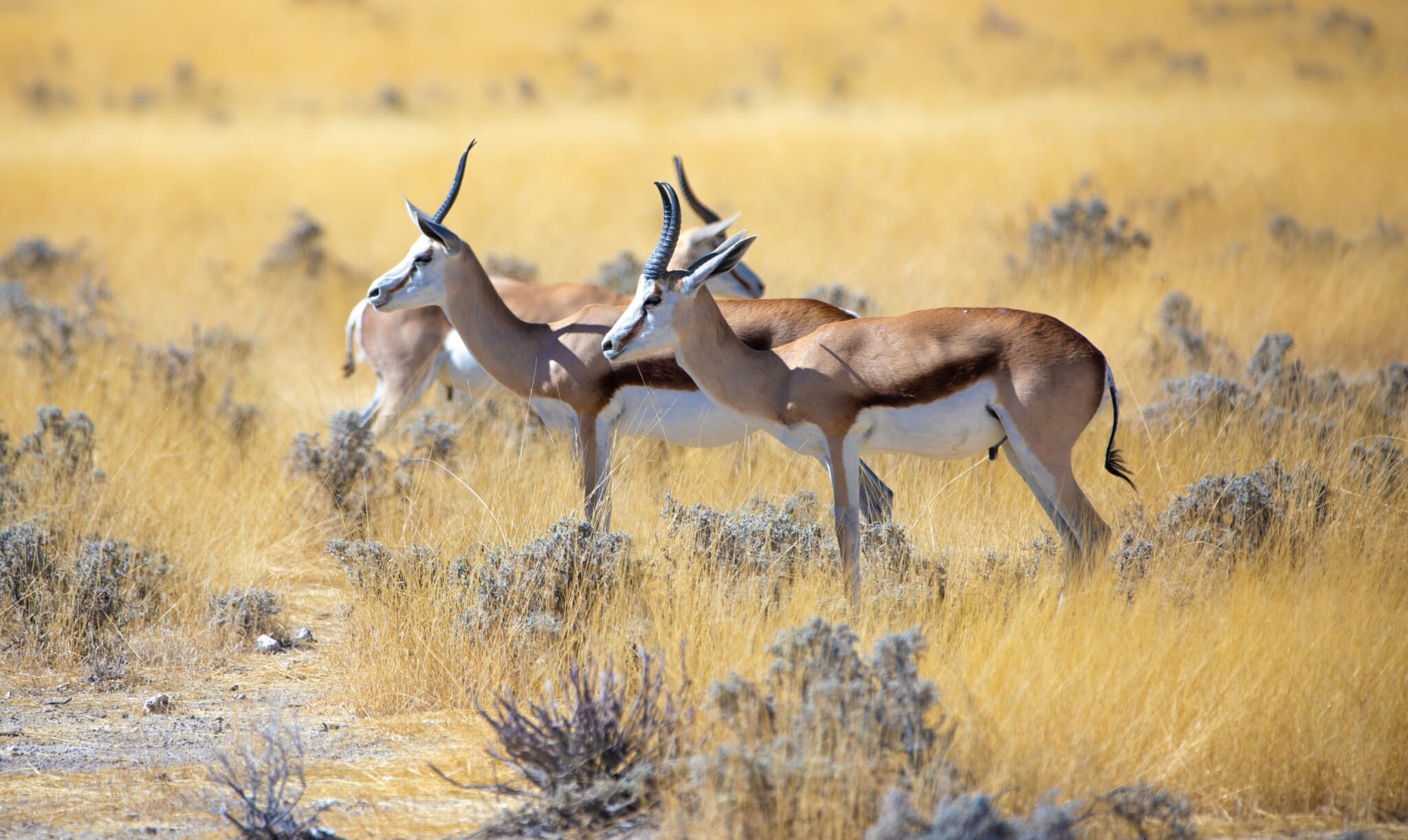 Der Springbock ist eine mittelgroße Antilopenart, die vor allem in den offenen Savannen und Halbwüsten des südlichen Afrikas vorkommt – insbesondere in Namibia, Südafrika und Botswana. Mit seinem charakteristischen weißen Gesicht, dem dunklen Seitenstreifen und der hellbraunen bis rötlichen Rückenfärbung ist er leicht zu erkennen. Seinen Namen verdankt er dem typischen „Pronking“ – dem plötzlichen, steifen Hochspringen mit durchgestreckten Beinen, oft zur Warnung oder bei Aufregung.