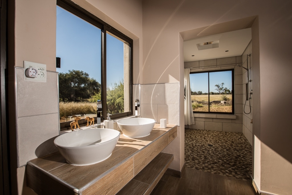 We offer 8 luxurious en-suite double rooms and are ideal for families or larger groups. You can also use the swimming pool, tennis court, riding horses and two tame cheetahs. Here you have 24-hour electricity, mobile phone network and internet access. We serve genuine Namibian delicacies, rounded off with fantastic South African wine, in our stylish Lapa. After dinner, an open-air fire pit invites you to linger.
